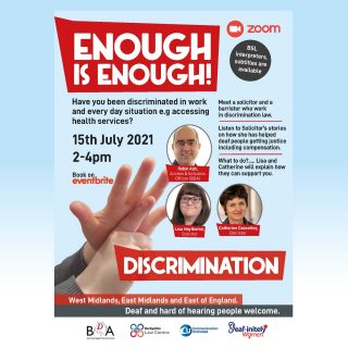 British Deaf Association, Communication Unlimited and Deaf-initely Women have joined forces with Derbyshire Law Centre and Cloisters Chambers to deliver an accessible online workshop to inform deaf, deafblinf and hard of hearing people of their rights in work and when accessing goods & services.